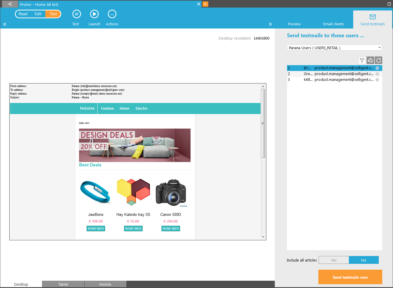 The button 'Send test mail now' actually sends the email to the selected test contacts.