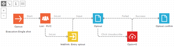 In this example the Input component serves as an entry point of an optout journey. The "Unsubscribe" sensor in other newsletter journeys link to this input component. This means that this optout part only has to be created once, in a separate journey. Instead of creating this in each newsletter journey for the unsubscribe sensor.
