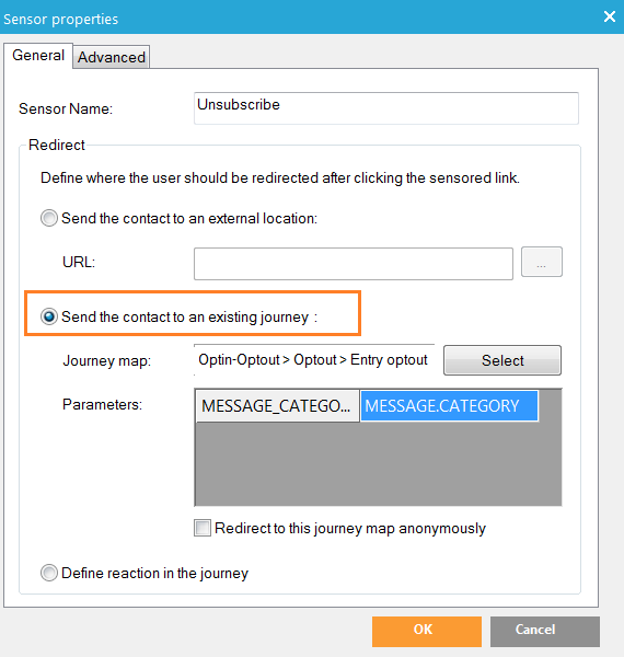 Unsubscribe sensor points to the Input component of the optout journey. Here a value is passed to the Input component's parameter MESSAGE_CATEGORY. The value is the email's message category (system variable) set in the message properties (message category drop-down menu):