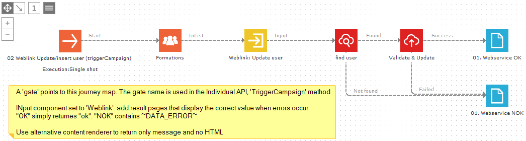 Instead of setting the Input component to 'Webservice' and returning a simple "ok" when the journey is executed, we used 'WebLink' and return a message on the "01. Webservice NOK" page. Here, the page only contains ~DATA_ERROR~, returning the Lookup's 'NotFound' message or the Data component's Failed error messages. When everything is updated correctly, the journey returns "ok" from the "01. Webservice OK" page.