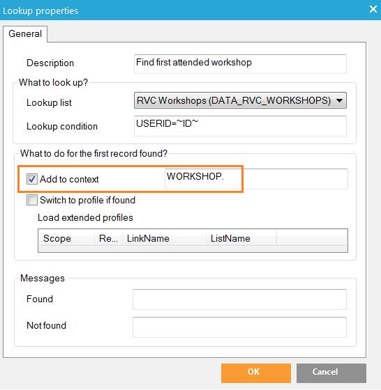 For example, you could use « WORKSHOP.WORKSHOPNAME » in a Decision component or « ~WORKSHOP.WORKSHOPNAME~ » (in Editor) on the next page. We do not enable the "Switch to profile, if found" option. This option will actually move to the Workshop record at the next step of the Journey, instead of staying on the contact's profile.