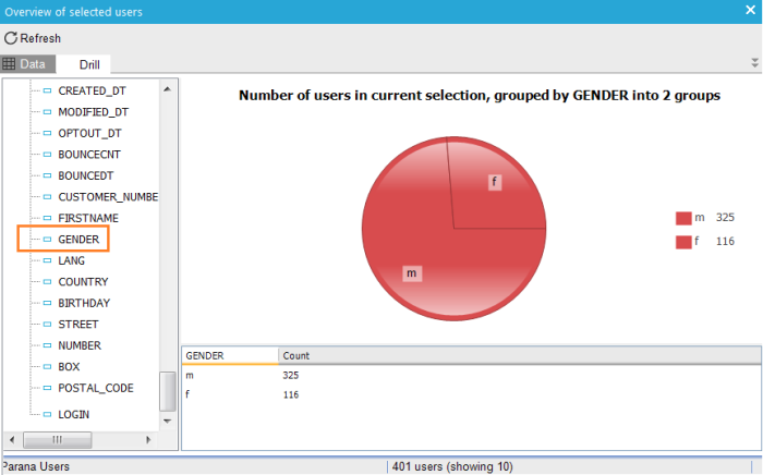 Example: To check if you selected only the men, you can drill by the GENDER field if the audience list. It displays the distribution of the contacts based on all the gender values in the field. Clearly, in this example the selection does not only contain the men, but also 116 women.