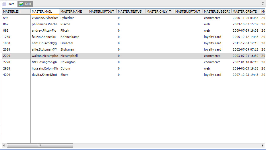 The 'Data' tab gives an overview of all contacts in the report. By default only the first 10 contacts in the report are shown. To see more contacts, click the drop down next to 'Limit results' and choose another value (100, 1000, 10000). The total amount of contacts in the report is shown in the status bar, in the bottom-right corner. 'Show optouts' will also list all contacts that are in the selection but have opted out (OPTOUT > 0) and will never receive the email.