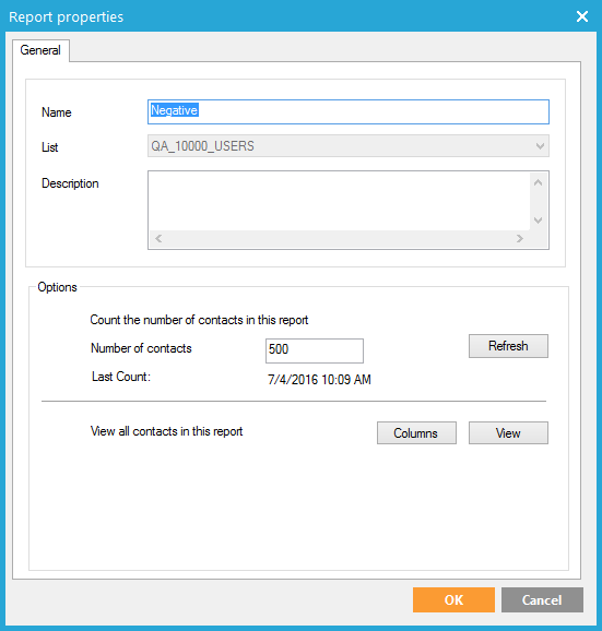 The button ‘Refresh’ calculates the number of contacts currently in this report. The date and time of the last calculation is indicated here.