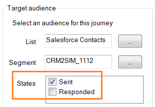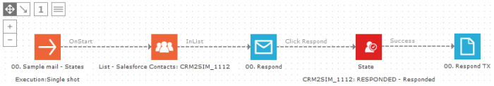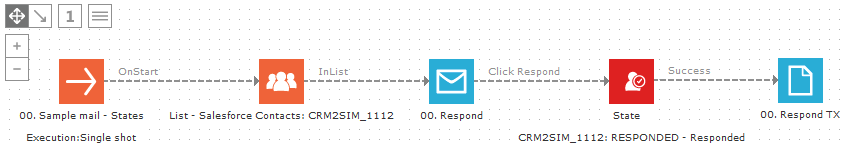 In the journey below, the target audience is a static segment "CRM2SIM_1112" with state "Sent", from the synced audience list "SalesForce contacts". After a contact clicks the "Respond" sensor in the email, the State component changes his state to "Responded". The CRM connector eventually syncs the contacts back to SalesForce (this is defined in the 'Settings', not in a journey). In SalesForce, the contacts who clicked the Selligent Campaign email, will have the state "Responded".