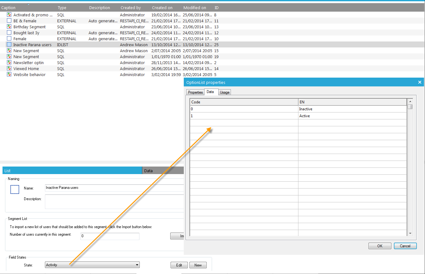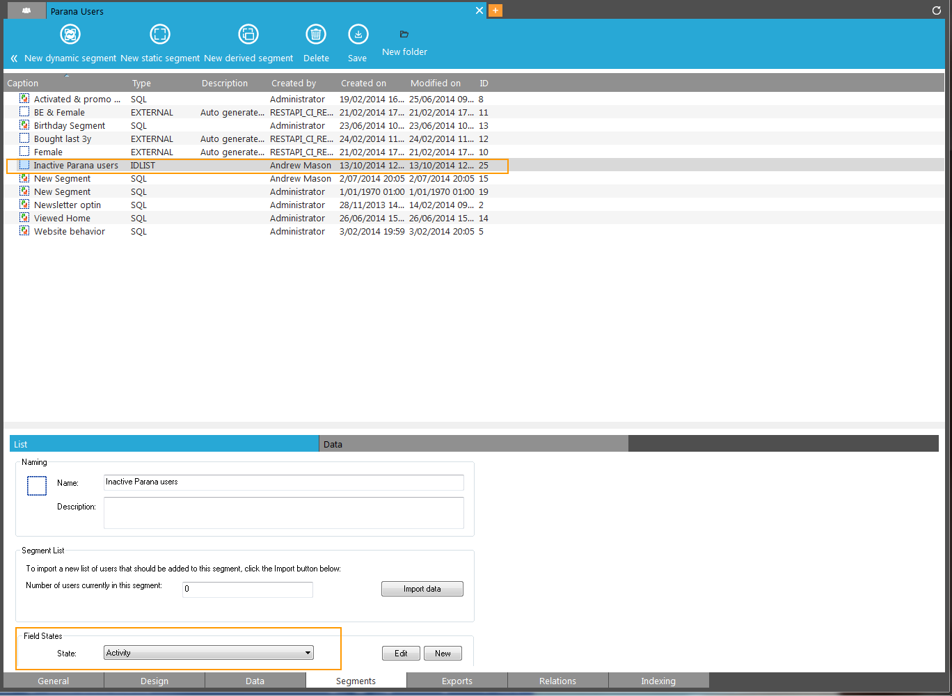 The State field for the segment ‘Inactive Parana contacts’ uses the option list ‘Activity’.