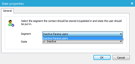 In the example below, the Selligent Audience list has a static segment "Inactive Parana users" with an option list linked to it under 'Field states'. This segment is therefore available from the drop down list in the State component.
