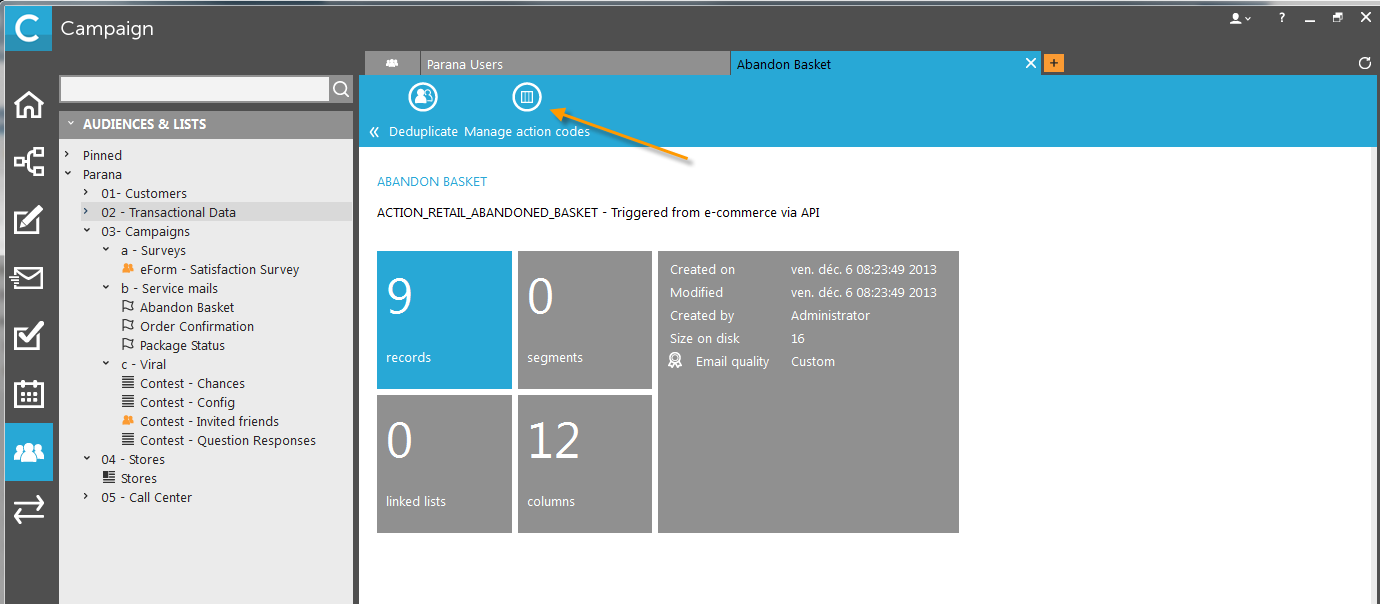 The different action codes, used in journeys, must be created on the action list. From the toolbar in an'Action list' tab, select ‘Manage action codes