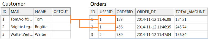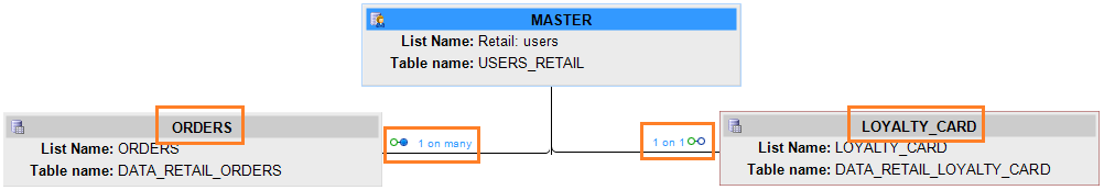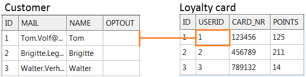 In this example, USERID is the foreign key on Customer ID and the relation is indicated by 'scope' name. For profile extensions (1:1),  you can use the scope name, which is LOYALTY_CARD in this case, to personalize your journey pages and emails. For instance: ~LOYALTY_CARD.POINTS~.