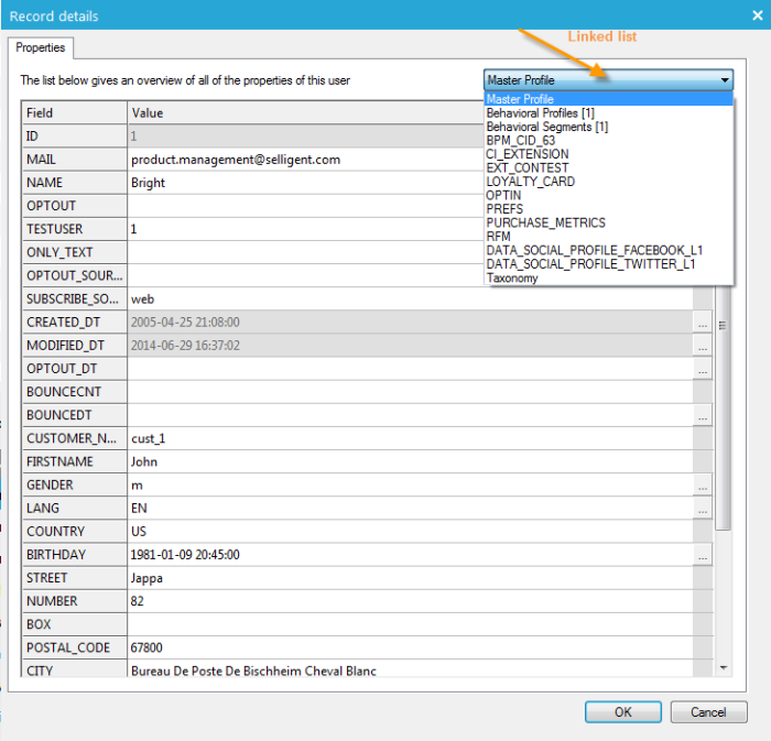 If values need to be entered in linked lists, this list can be selected from the drop down field at the top of the dialog. This is only possible for 1:1 related lists.