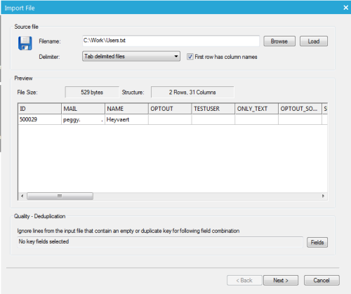 To guarantee clean data, it is possible to remove duplicate records from the source based on one or more fields. Use the 'Fields' button in the 'Quality - Deduplication' section.