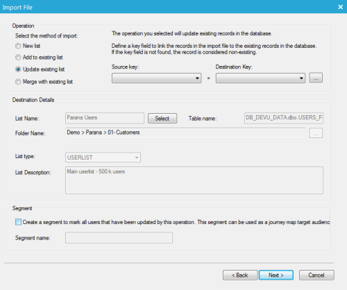 - update an existing list: records in a list are updated with the imported data. A key field is required to match records in the source with records in the Selligent list. If no corresponding record is found in the Selligent list, the record from the source is not created.