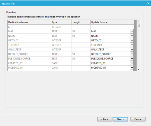 3. In the following step a mapping is defined between the source fields and the fields in the destination table.