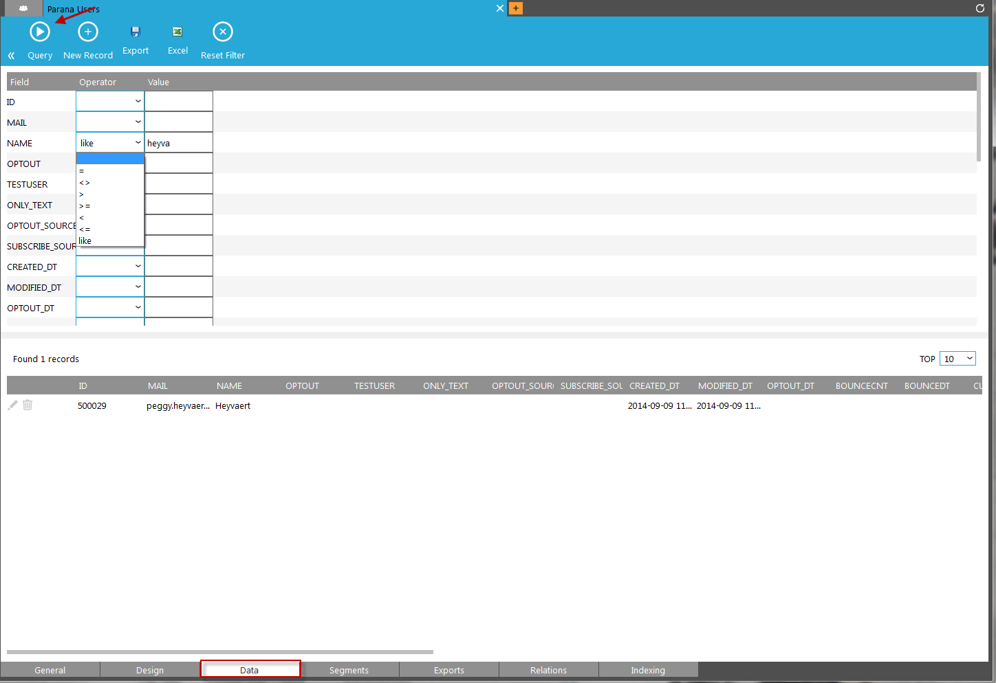 The result of the query is displayed in the lower part of the 'Data' tab. Records can be edited directly in the result table or deleted.