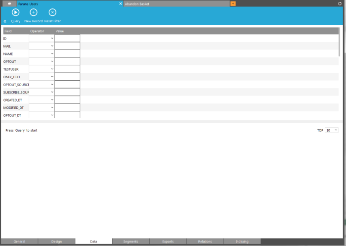 To limit the result, use the search fields in the upper section to define criteria on one or more fields. Adding multiple search criteria will result in an AND operation. E.g. Gender='M' AND Lang='EN'
