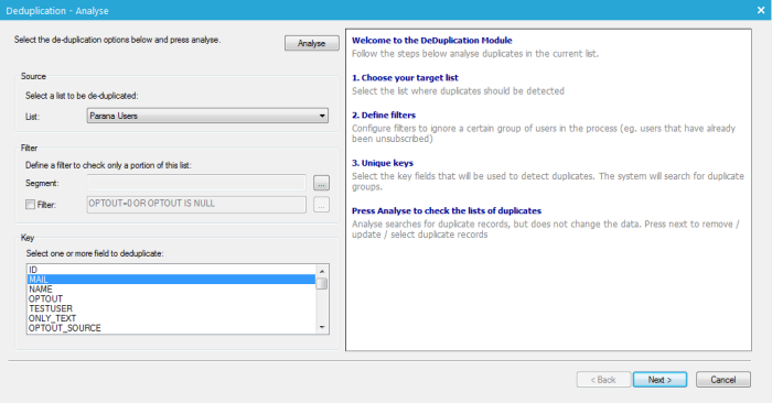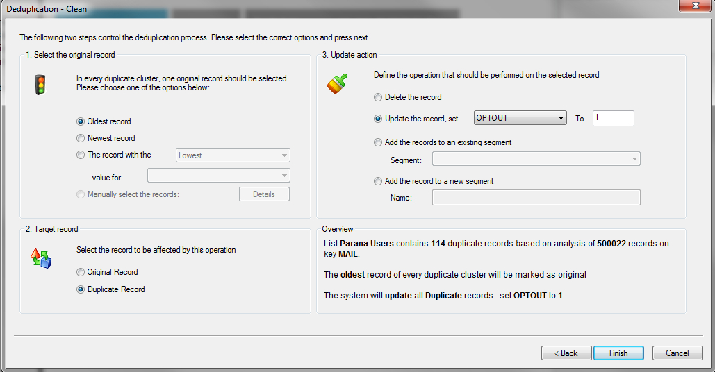 The duplicate records can also be handled automatically by defining which record has priority, what record should be kept and what should happen to the duplicate records: remove them, add them to an existing or new segment or simply update field in the list with a specific value.