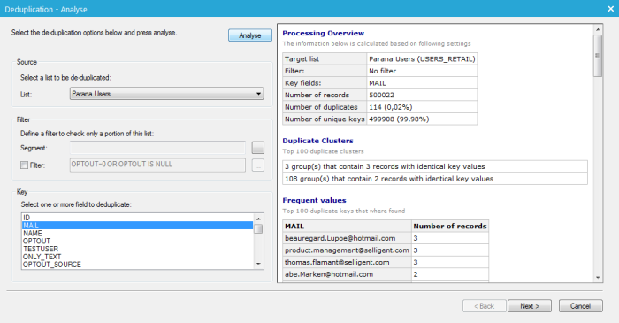 This overview shows you how many records and how many duplicates are available in this list. It also provides an overview of the top 100 values that occur in the list.