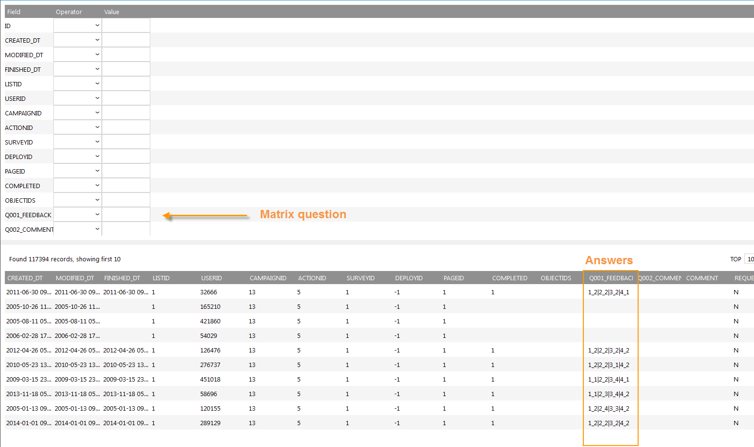 • SURVEYID: ID of the form. Matches the number of the Form table, e.g. SURVEY_3