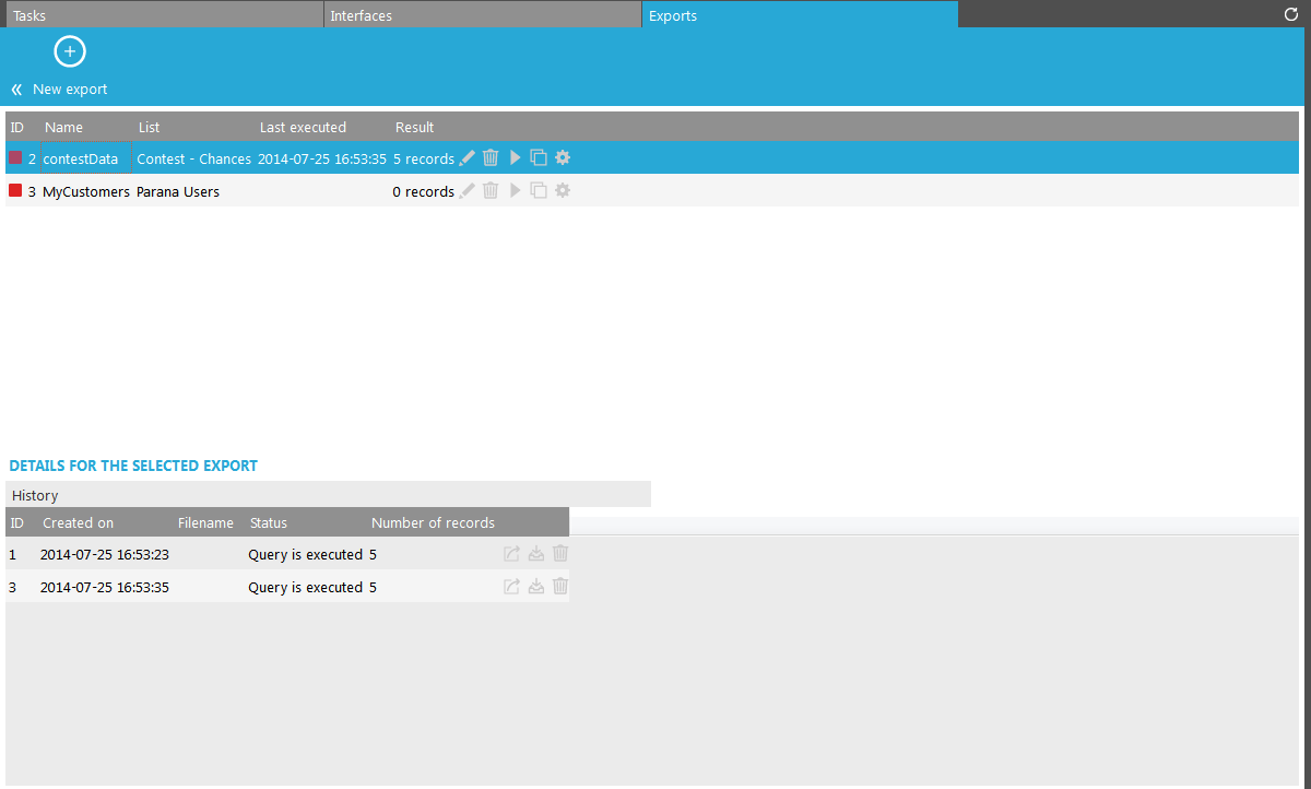 The lower part provides details on a selected export such as date of execution, status and number of records.
