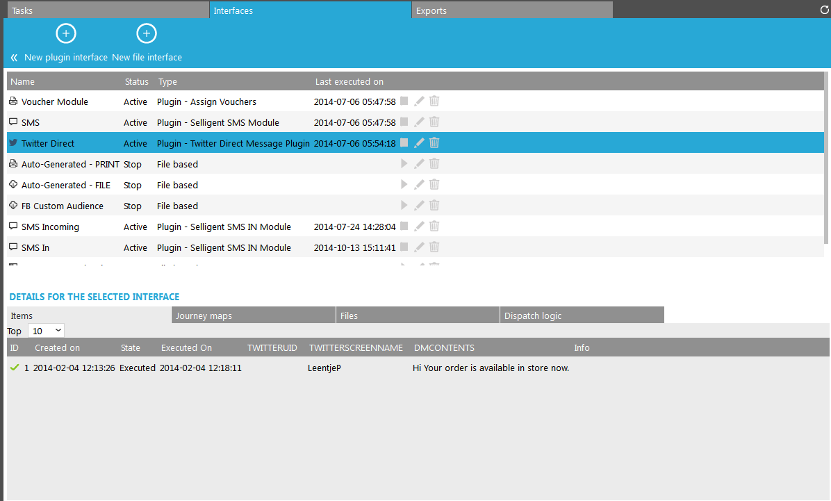 - Dispatch logic [ plugin-based inbound interfaces such as SMS In]— Creates and displays the dispatch logic for incoming SMS messages and allows the creation of SMS dialog (for more details check this topic). A set of rules checks the incoming records and triggers the correct action in the journey.