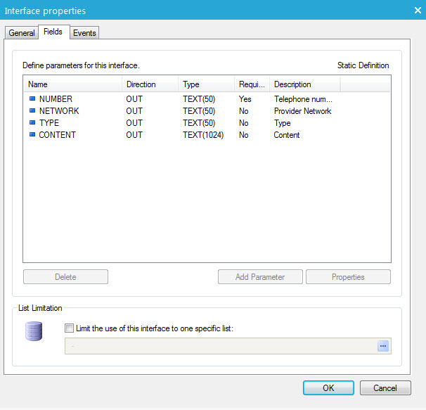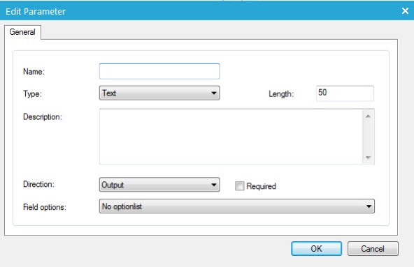 NOTE: Parameters can only be defined in here when ‘No module’ has been selected on the‘General’tab. When a specific module is selected, the parameters are defined within the corresponding dll and are displayed automatically on the 'Fields' tab. They can not be edited.