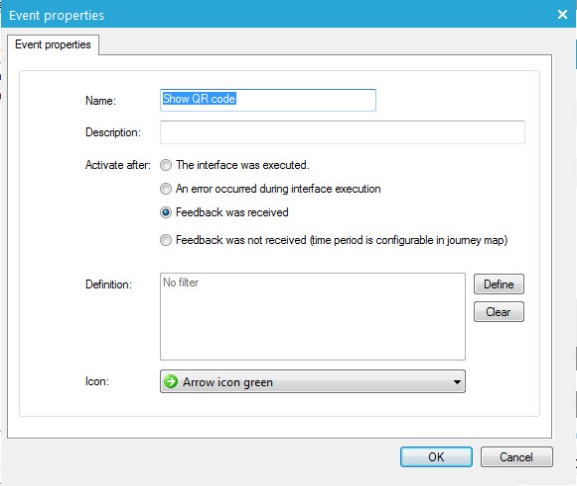 Define feedback events and assign a flag. These events can be used in the journey after an interface component. Define constraints and specify the activation method.