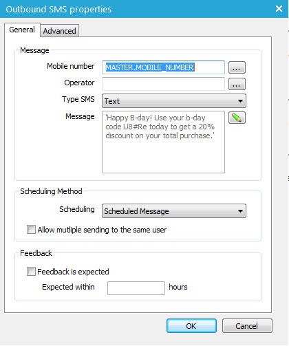 - Message: Contains the data for the SMS, including the text inserted into the SMS. Note that both can contain personalization fields. The icon next to the 'Message' field gives access to an editor allowing the composition of the message. A preview of the message is available from the editor.