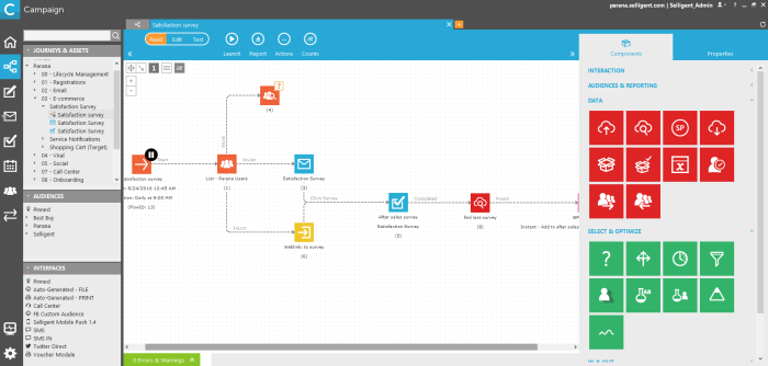 The creation, management, planning, and follow-up of marketing campaigns require multiple interventions on different levels, from the creation of contact lists, through the design of nice looking messages up till the planning of the actual customer journey. To simplify the process all elements required to complete the process are grouped in one single interface: Selligent Campaign.