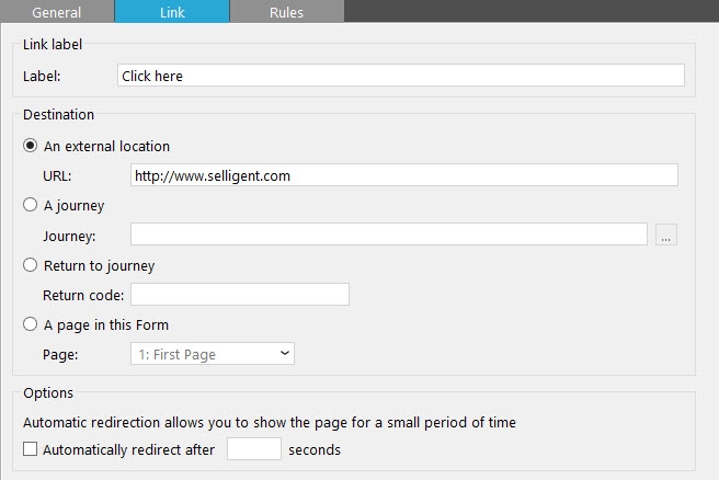 - Automatically redirect after — The contact does not need to click the hyperlink. He is redirected automatically after a given period of time.