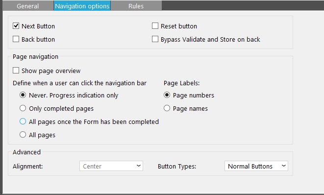 Use: navigation controls appear on each page and are placed in the header' and the footer of the page. When creating a form for mobile use, only use the 'page navigation' if you're sure there is enough space on the mobile device. If there are too many pages, navigation with page numbers will be difficult.