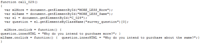 This following onLoad script sets the question value of component "C_028" depending on which answer is clicked on the MORE_LESS radio buttons on the same page. This insert is taken from the customer satisfaction survey step-by-step example