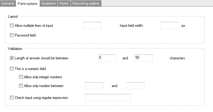 - Length of answer between: validation rule, enter the minimum and maximum allowed characters (related error label : FIELD_TOO_SHORT, FIELD_TOO_LONG)