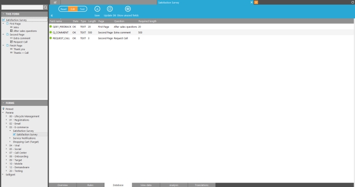 The 'Database' tab provides an overview of all the fields within the form. Each field is linked to an Form component (question). The answers to the form will be stored in this form list.