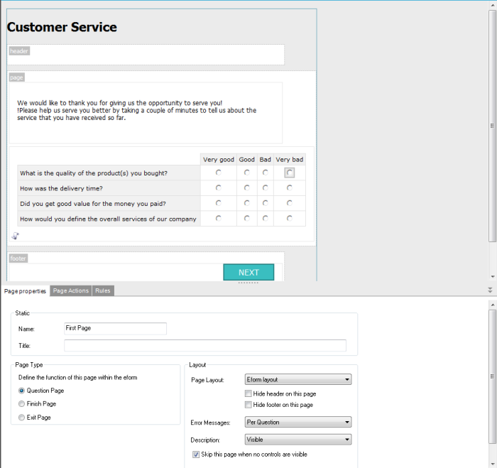 - Skip the page when no controls are visible: if no questions are displayed the page is skipped. This could be the result of rules applied to the questions with as result that for a specific contact no elements are displayed on the page.