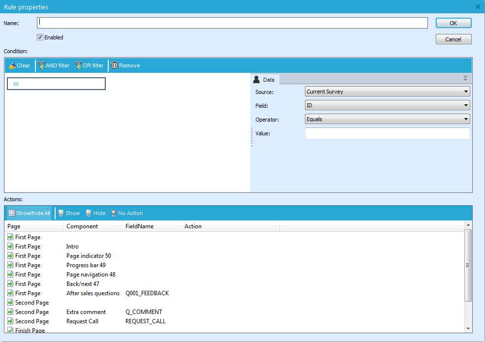 - Add rule: creates a rule that conditions the display of a question