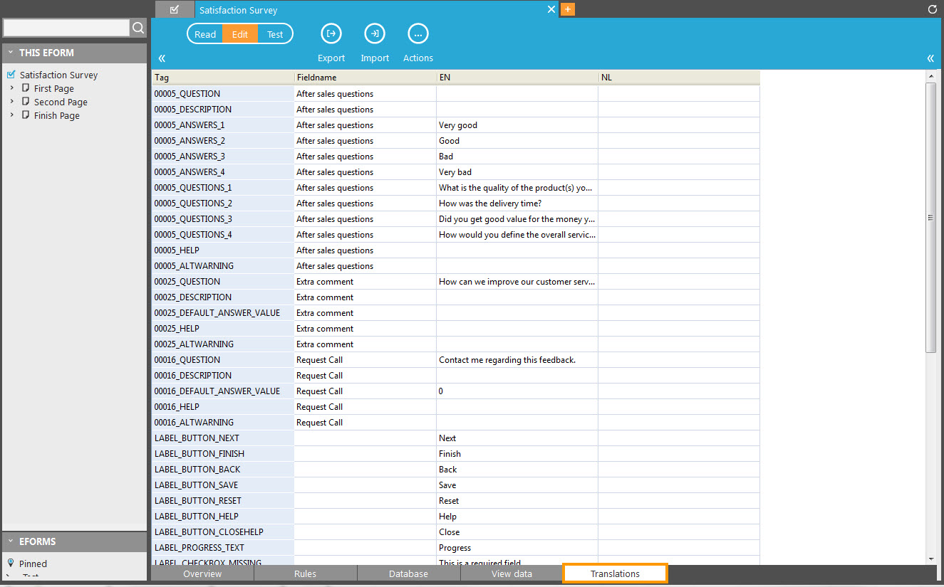 All questions, answers, descriptions, error messages, online help and labels can be translated in every language that has been configured in the form properties. These translations can be created manually in the Translation table or imported from a file delivered for instance by a translation agency.