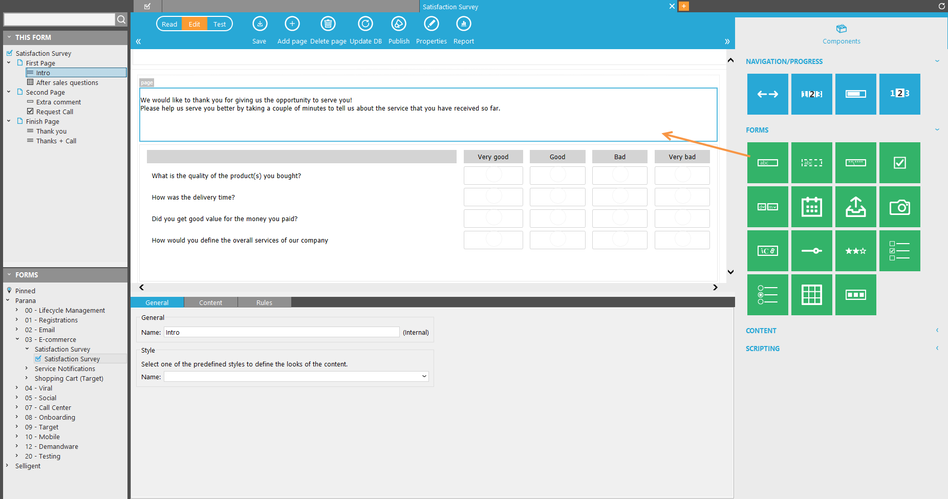 Selligent provides numerous components to design your form. These components are available through the 'Component panel' at the right of the main window, when a page is selected.