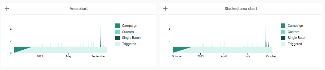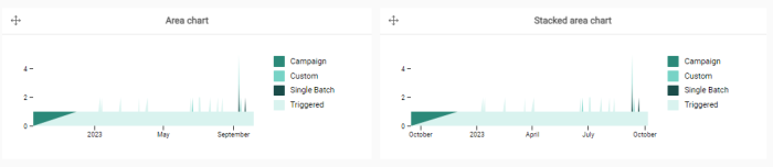 Take population for example: Line charts are good for showing net change in population over time, while area charts are good for showing the total population over time.