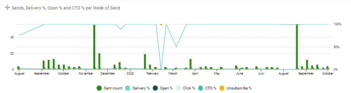 We want to display the number of records sent, the delivery rate, Open rate, click rate, click to open rate and unsubscribe rates, and this on a timeline