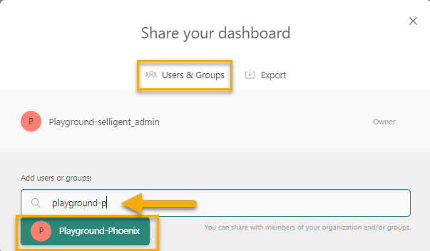 A dialog is displayed where you can share the dashboard with other users and groups: