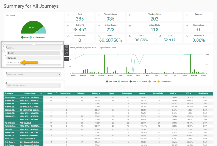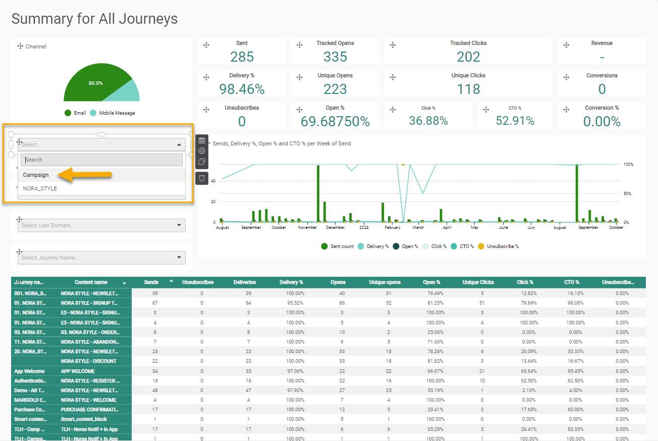 Note 3: Hybrid customers using Campaign and Selligent will see an additional option in the Business unit filter drop-down: Campaign. In hybrid environments it is also possible to filter on Campaign execution data in a dashboard.