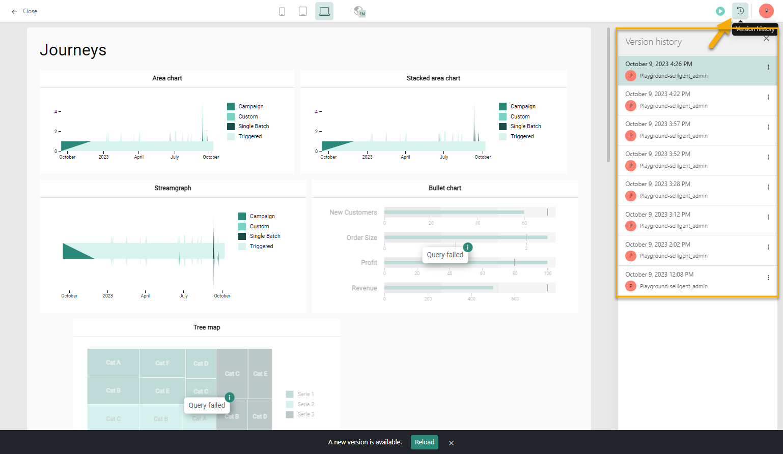 Dashboards are often a continuous process, where changes are made along the way, based on feedback or new requirements. To visualize the changes over time, a version history is available, providing a chronological overview of the changes made. Clicking on a version displays the dashboard in the state corresponding to that version: