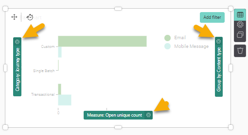 For measures, there are additional options. Click the Settings icon associated to the measure, category or Group by field. (Note: this settings icon is only displayed when the Data icon in the upper right corner is selected.)