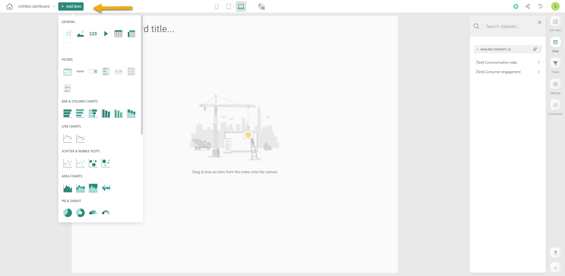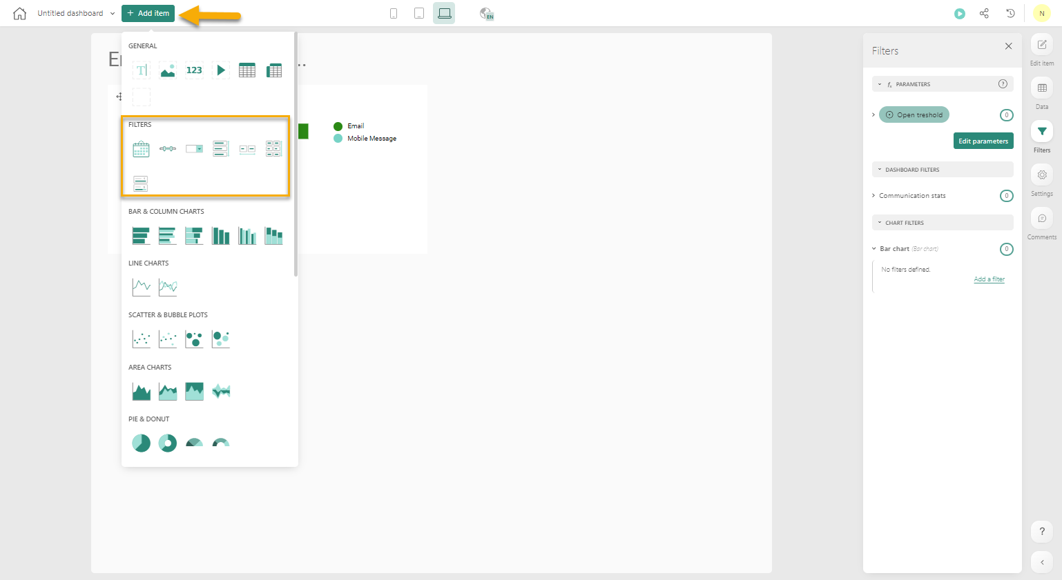 4. At the top, click the Add Item to access the components available for use in the dashboard. Select one from the overview to add it to the dashboard.