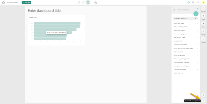 5. Next, data is required. Select the dataset to use for this dashboard from the datasets available to you on the right of the screen