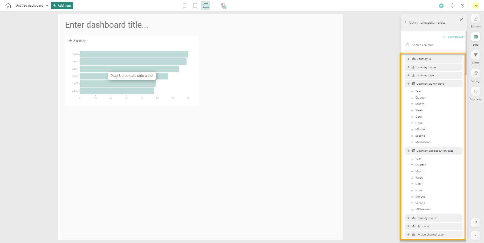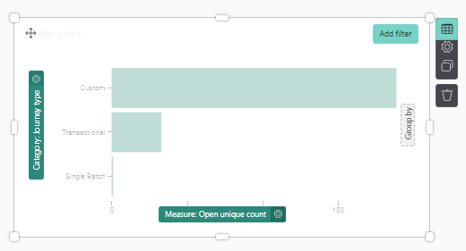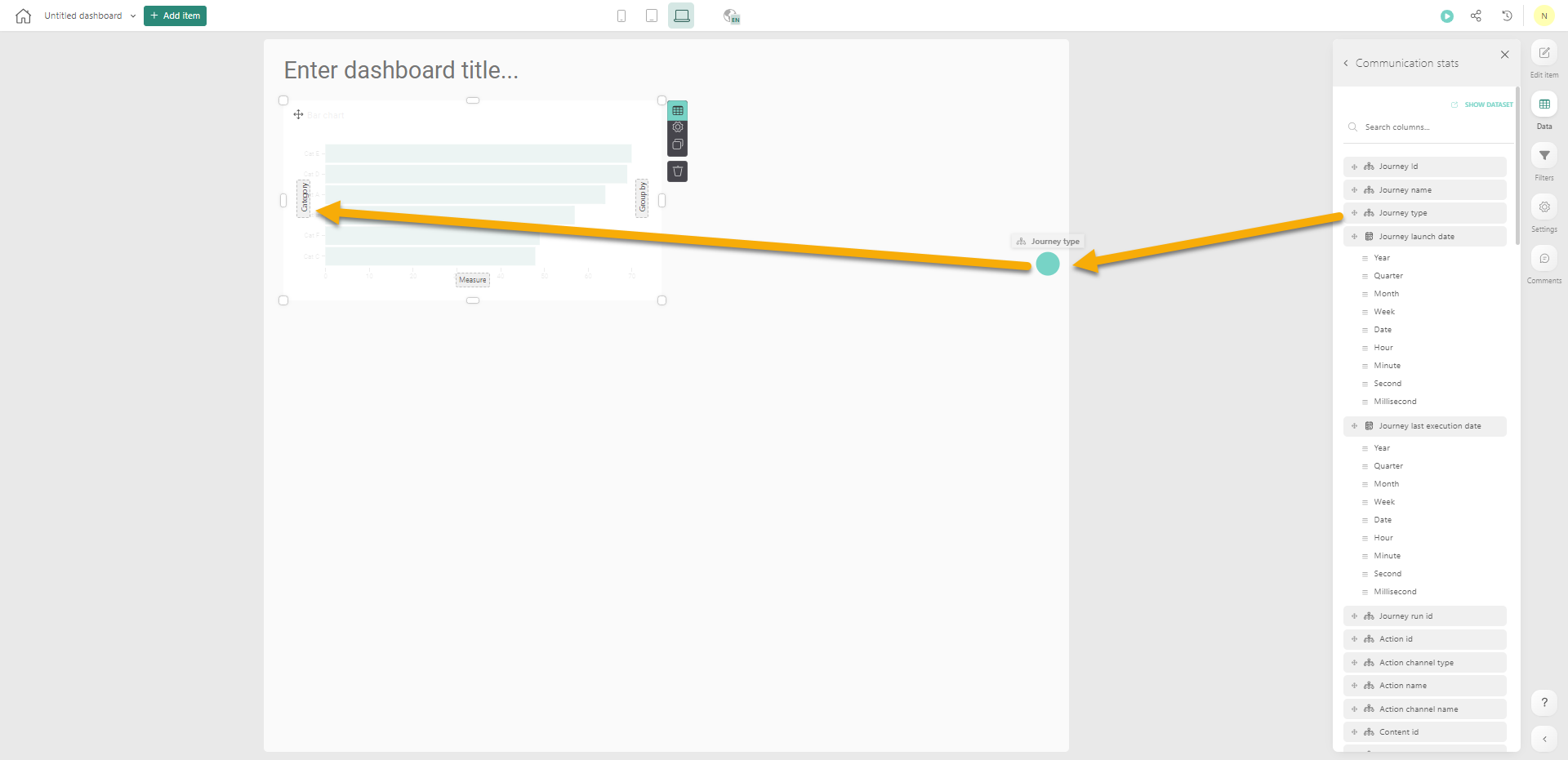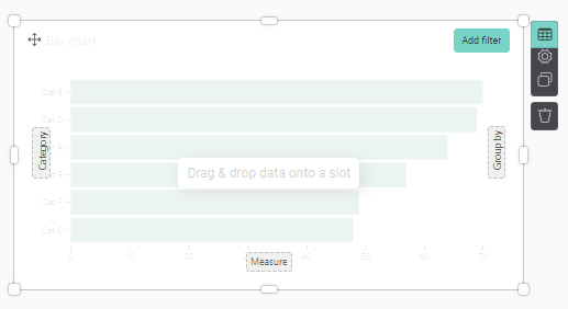 To start, you’ll need to drag & drop a data-field in the graphical component, on the dotted squares. The component clearly indicates where a category, group by or measure is expected: