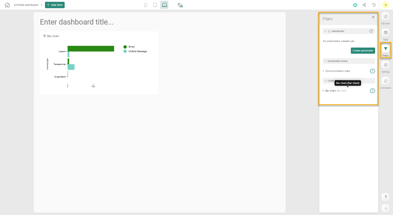 Note: When designing a dashboard, check the layout of the dashboard in the different layout views (mobile, tablet, desktop, large screen) and ensure the composition is as wanted. Use the layout buttons at the top to switch from one layout view to another.