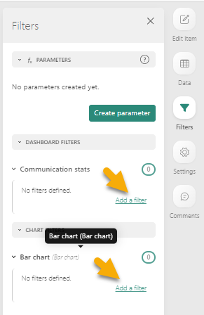 • Add filter - allows to add a filter that will only apply to this specific component. The Add filter button is only displayed after clicking the Data icon.