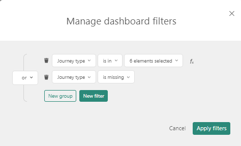 When either one of the conditions is met, the journeys are included in the dashboard. This means that the OR operator is applied as following between the 2 groups of filters: