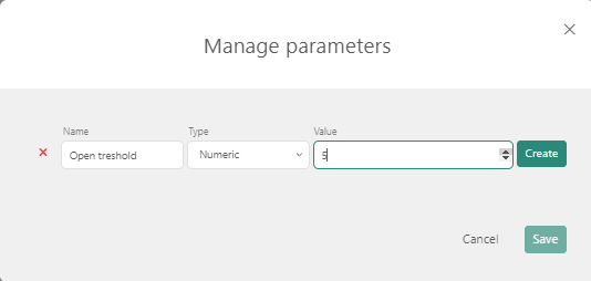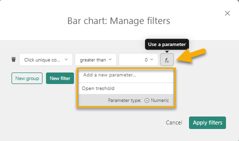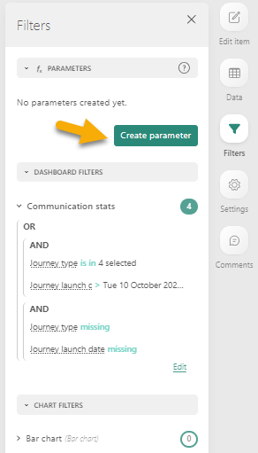 To create a parameter, go to the Filter tab and click the Create parameter button:
